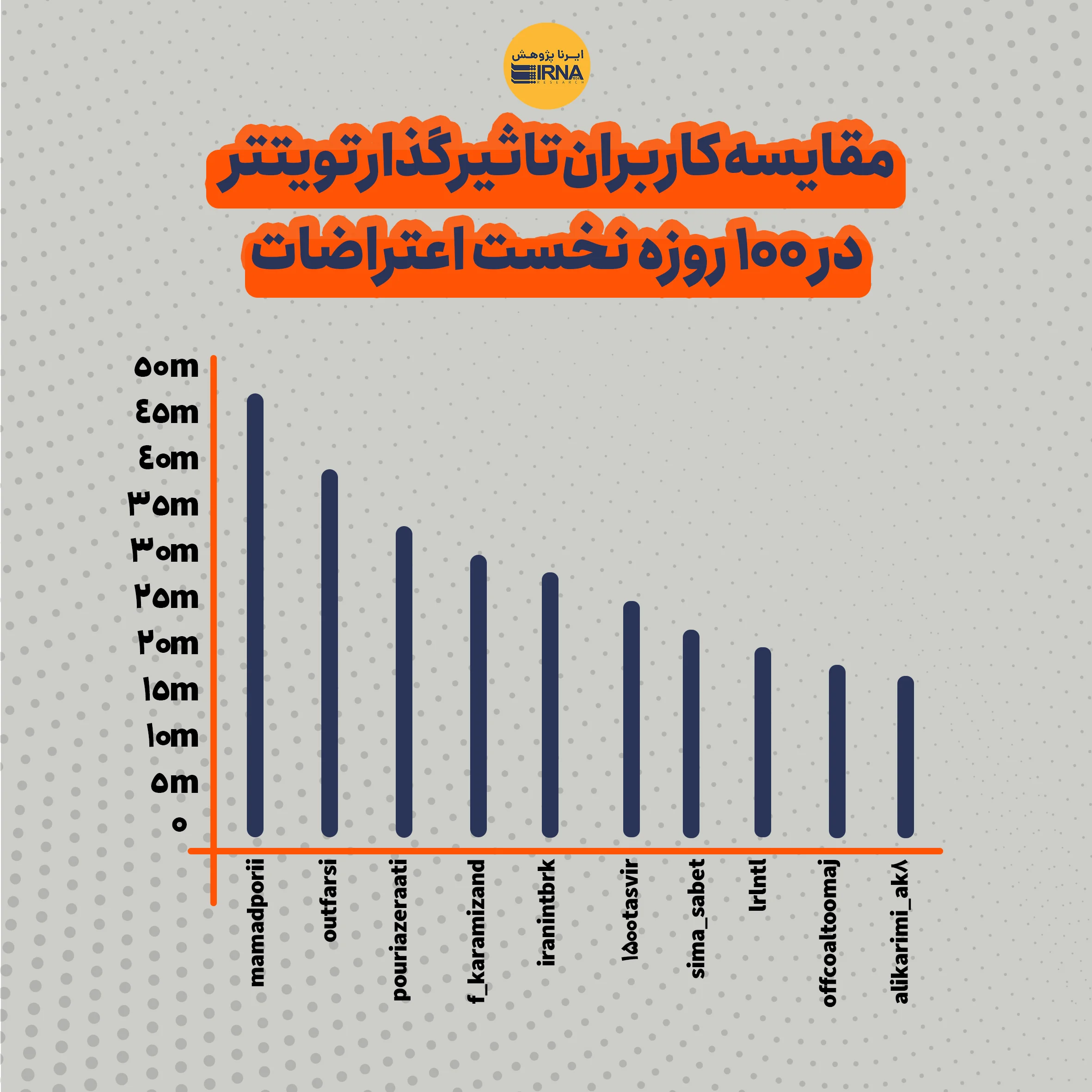 در میان ۱۰ چهره و رسانه نخست کاربران تاثیرگذار، جملگی به جریان برانداز و مخالف نظام تعلق داشتهاند: ممد پوری با ۴۵ میلیون لایک پیشتاز است. outfarsi، ایران اینترنشنال و ۱۵۰۰ تصویر سه رسانه تاثیرگذار توئیتریها با ۳۹، ۲۷ و ۲۱ میلیون لایک بودهاند.
