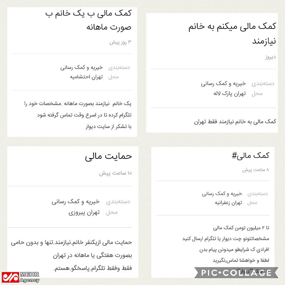 سایت دیوار یکی از سایتهای اعلام آگهی است که در همین چند سالی که راه افتاده، طرفدارهای خودش را پیدا کرده است و اتفاقا جای خوبی برای فروش چیزهاییست که نیاز ندارید. اما در یکی دو هفته گذشته آگهیهای عجیبی در این سایت منتشر شد؛ «کمک مالی به خانم»، «کمک مالی و غیر مالی»، «کمک مالی به خانم نیازمند»، «کمک مالی به خانم دانشجو» و …. عنوان این آگهیهاست.