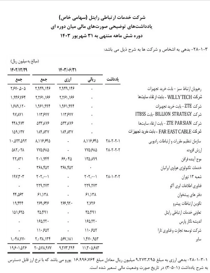 طبق اطلاعات صورت‌های مالی و تایید شده حسابرس، میزان بدهی‌های ریالی رایتل در نیمه نخست سال قبل از مرز یک هزار و ۱۳۰ میلیارد تومان عبور کرده و در همین حال، بدهی‌های ارزی این شرکت نیز معادل ارزی نزدیک به ۱۷ میلیون یورو (معادل ۹۲۷ میلیارد تومان) شده است....