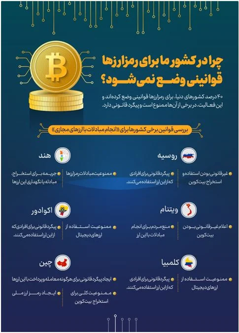 به گزارش فارس، اظهارات ناصر حکیمی معاون سابق فناوریهای نوین بانک مرکزی، بررسیها نشان میدهد تنها 40 درصد کشورهای دنیا، برای رمزارزها قانون وضع کردهاند! در این بین، برخی کشورها استخراج و تبادل رمزارز را در کشور خود ممنوع اعلام کردند؛ «تقابل با حاکمیت پولهای ملی و نظم اقتصادی»، «فراهم کردن ایجاد بستر برای تأمین مالی فعالیتهای غیرقانونی» و «تسهیل خروج سرمایه» از جمله دلایلی است که از سوی این کشورها برای ممنوعیت استخراج یا تبادل رمزارزها اعلام شده است. در اینفوگرافی بالا به برخی قوانین وضع شده در این کشورها اشاره شده است.