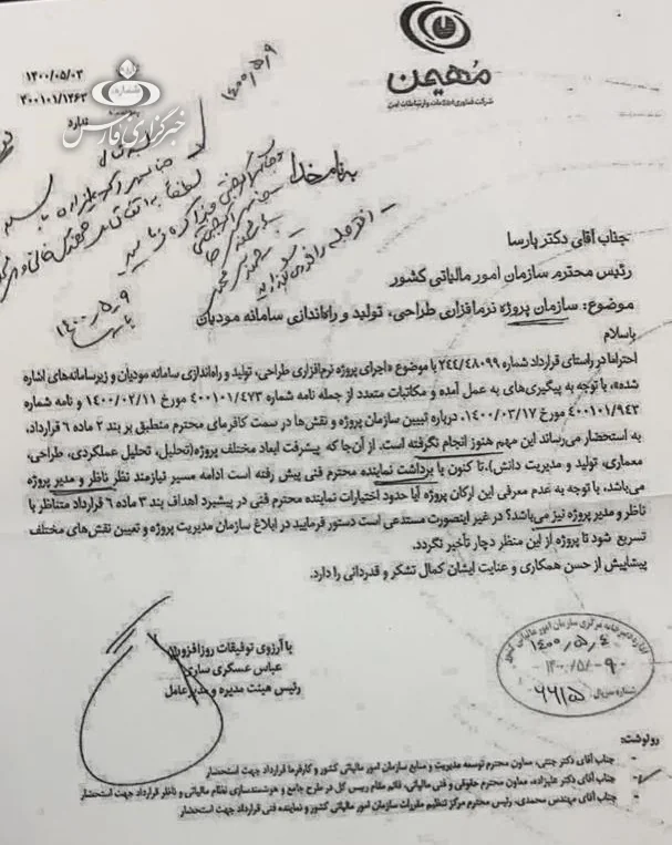 عباس عسکری ساری مدیرعامل شرکت مهیمن در نامه به امید علی پارسا رئیس سازمان امور مالیاتی به موضوع سازمان پروژه نرم افزاری طراحی، تولید و راه اندازی سامانه مودیان پرداخته است.
