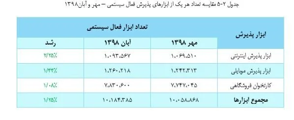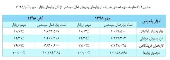 بر اساس جدول فوق، تعداد کارتخوانهای فروشگاهی فعال سیستمی در شبکه پرداخت الکترونیک با افزایش ۱.۰۸ درصد ی به تعداد ۷ میلیون و ۸۳۰ هزار دستگاه رسیده است؛ همچنین تعداد ابزار پذیرش اینترنتی فعال به یک میلیون و ۹۳ هزار ابزار و تعداد ابزار پذیرش موبایلی فعال به یک میلیون و ۲۶۰ هزار ابزار پذیرش افزایش داشته است؛ بر اساس آمار اعلام شده از سوی شاپرک، تعداد ابزارهای پذیرش در شبکه پرداخت الکترونیک در آبان ماه نسبت به مهر ماه سال جاری ۱.۲۵ درصد رشد داشته و به بالغ بر ۱۰ میلیون و ۱۸۴ هزار ابزار فعال سیستمی رسیده است.