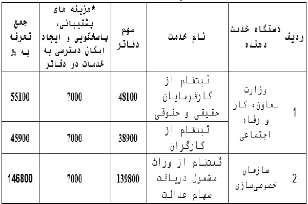 در این مصوبه، علاوه بر تعرفه درنظر گرفته شده، سهم دفاتر برای عرضه خدمات موضوع بند (پ) ماده (۶۷) نیز مطابق با جدول زیر تعیین شده است.
