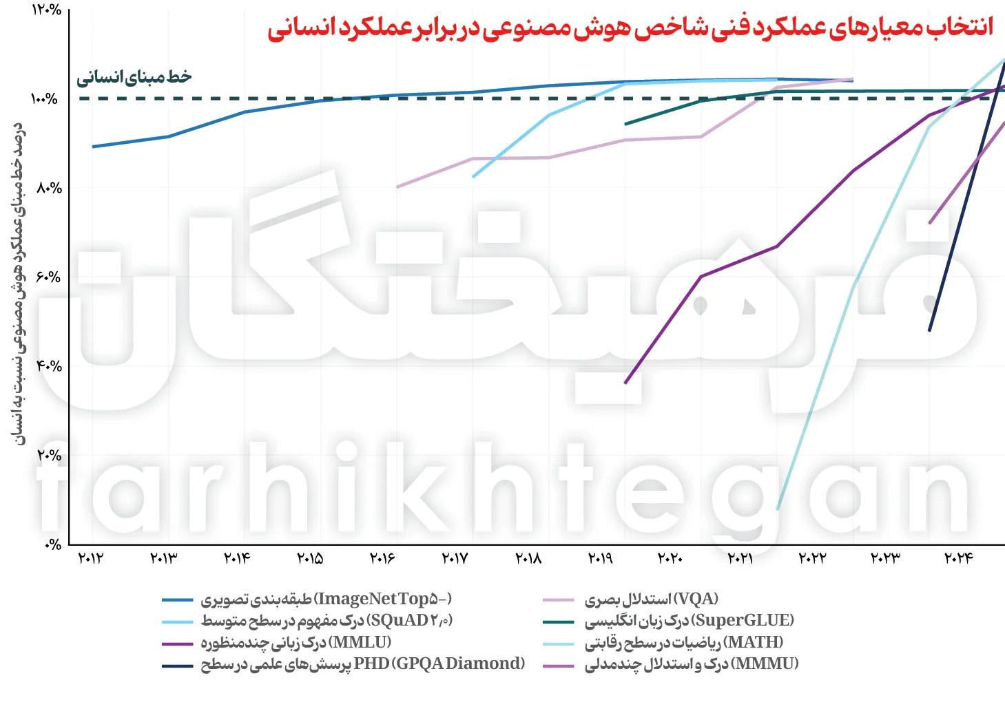 محققان در سال ۲۰۲۳ معیارهای جدیدی را مانند GPQA، MMMU و SWE-bench برای آزمایش محدودیتهای سیستمهای هوش مصنوعی پیشرفته معرفی کردند. معیار GPQA یک آزمون طراحیشده برای سنجش توانایی مدلها در پاسخ به سؤالات عمومی است. معیار MMMU نیز مربوط به درک عمومی زبان در موضوعات مختلف است. معیار SWE-bench نیز آزمونی برای رفع مشکلات کد است. تنها یک سال بعد، عملکرد آنها افزایش یافت بهطوریکه امتیاز آنها به ترتیب برای GPQA، MMMU و SWE-bench حدود ۲۰، ۴۹ و ۶۷ درصد رشد پیدا کرد. فراتر از معیارها، سیستمهای هوش مصنوعی گامهای بزرگی در تولید ویدئوهای باکیفیت بالا برداشتند و در برخی تنظیمات، عوامل مدل زبانی حتی در کارهای برنامهنویسی با بودجههای زمانی محدود، عملکرد بهتری نسبت به انسانها از خود نشان دادند.