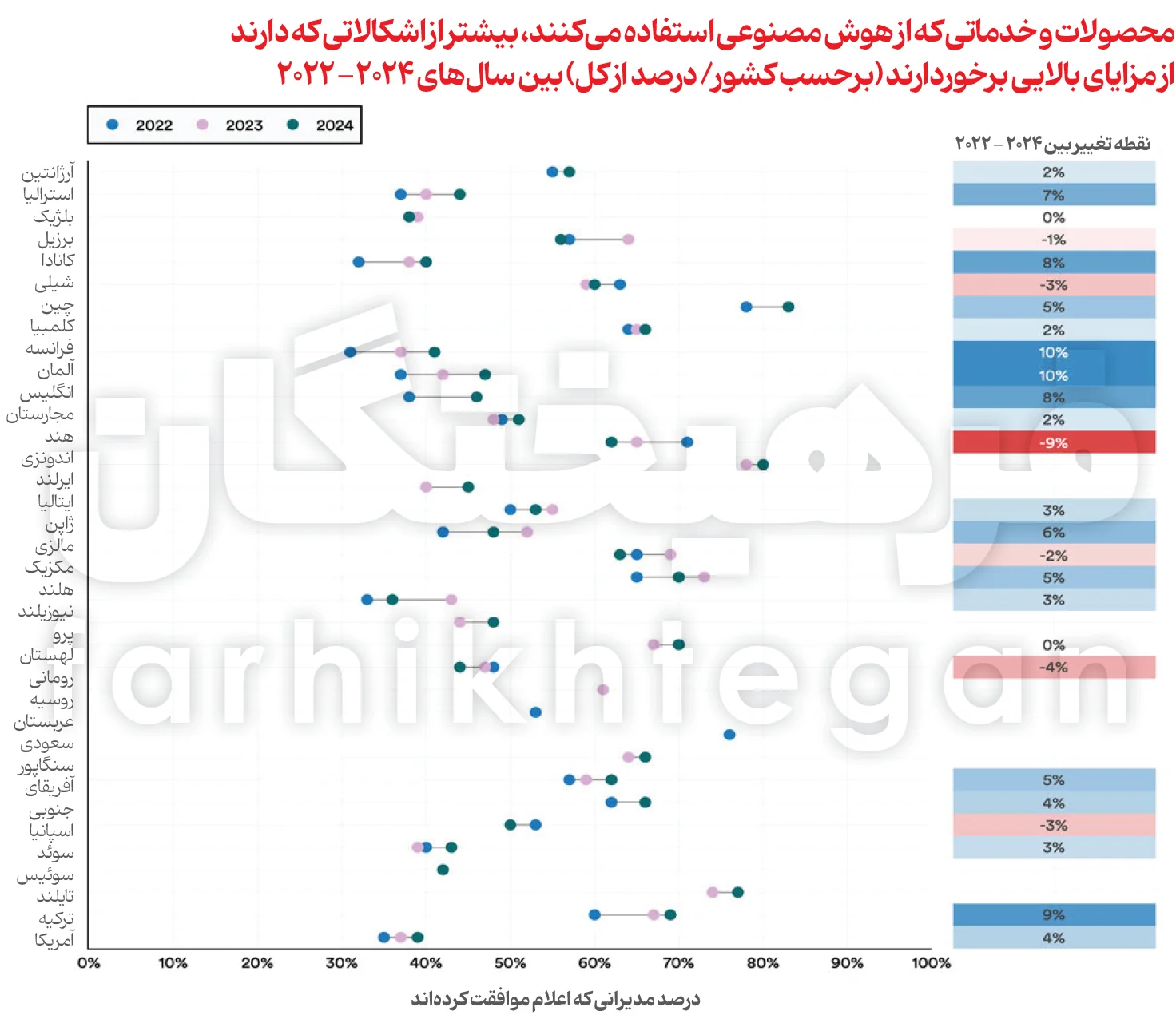 یافتهها نشان میدهد که کشورها، بسیاری از تولیدات هوش مصنوعی را بیشتر از آن که مضر بدانند، مفید قلمداد میکنند. در این میان، در چین 83 درصد، در اندونزی 80 درصد و در تایلند 77 درصد، بیشتر محصولات و خدمات هوش مصنوعی را مفید میدانند تا مضر. در مقابل، دید مثبت نسبت به هوش مصنوعی در کشورهایی نیز پایینتر است؛ بهعنوان مثال، 40 درصد از مردم کانادا، 39 درصد از مردم آمریکا و 36 درصد از مردم هند، نگاه مثبتی به این فناوری نوظهور دارند. از سال 2022، خوشبینی برخی کشورهایی که دید منفی به هوش مصنوعی داشتند رشد قابلتوجهی داشته است بهطوری که آلمان و فرانسه با رشد 10 درصدی، کانادا و انگلیس با رشد 8 درصدی و آمریکا با رشد 4 درصدی روبهرو شدند.