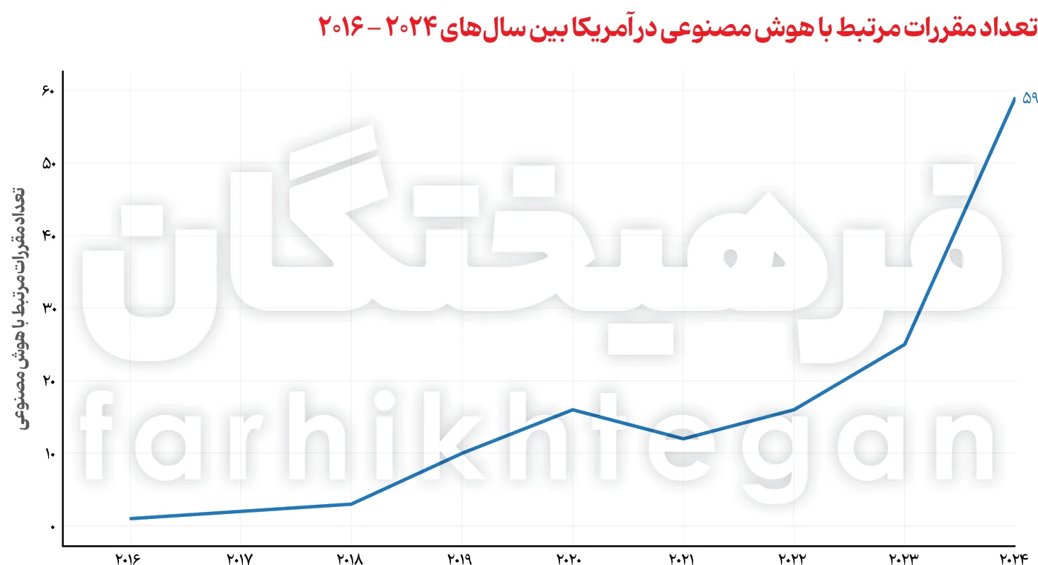 آژانسهای فدرال آمریکا در سال 2024، حدود 25 مقررات مرتبط با هوش مصنوعی را صادر کردند که در مقایسه با سال 2023، به بیش از دوبرابر رسید و نیز تعداد آژانسهای صادرکننده این مقررات نیز نسبت به سال قبل از آن دوبرابر شد. در سطح جهانی، اشاره قانونی به هوش مصنوعی در 75 کشور از سال 2023 به بیش از 21 درصد افزایش یافت که بیانگر افزایش 9 برابری از سال 2016 است. علاوه بر توجه رو به رشد این قوانین، دولتها سرمایهگذاریهای خود را بر همین مقیاس میسنجند و برآورد میکنند. براین اساس، کانادا متعهد به سرمایهگذاری 2 میلیارد و 400 میلیون دلاری شده است. همچنین چین متعهد به سرمایهگذاری 47 میلیارد و 500 میلیون دلاری، فرانسه متعهد به سرمایهگذاری 123 میلیارد و 585 میلیون دلاری و هند متعهد به سرمایهگذاری یک میلیارد و 250 میلیون دلاری در حوزه نیمهرساناها شدهاند و عربستان سعودی در قالب پروژه Transcendence یک راهکار ابتکاری 100 میلیارد دلاری را ارائه میدهد.