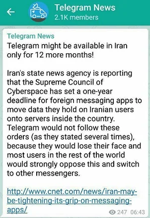 در اخبار برخی سایتهای داخلی به نقل از سایت سینت، از قول پیامرسان تلگرام آمده است که تلگرام شاید تنها تا 12 ماه آینده در ایران قابل دسترسی باشد.