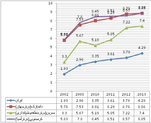 کشور اول و دوم منطقه بحرین و امارات متحده عربی با امتیاز‌های 7.40 و 7.03 بوده و ایران به لحاظ امتیازی در رتبه 9 منطقه خاور میانه است.