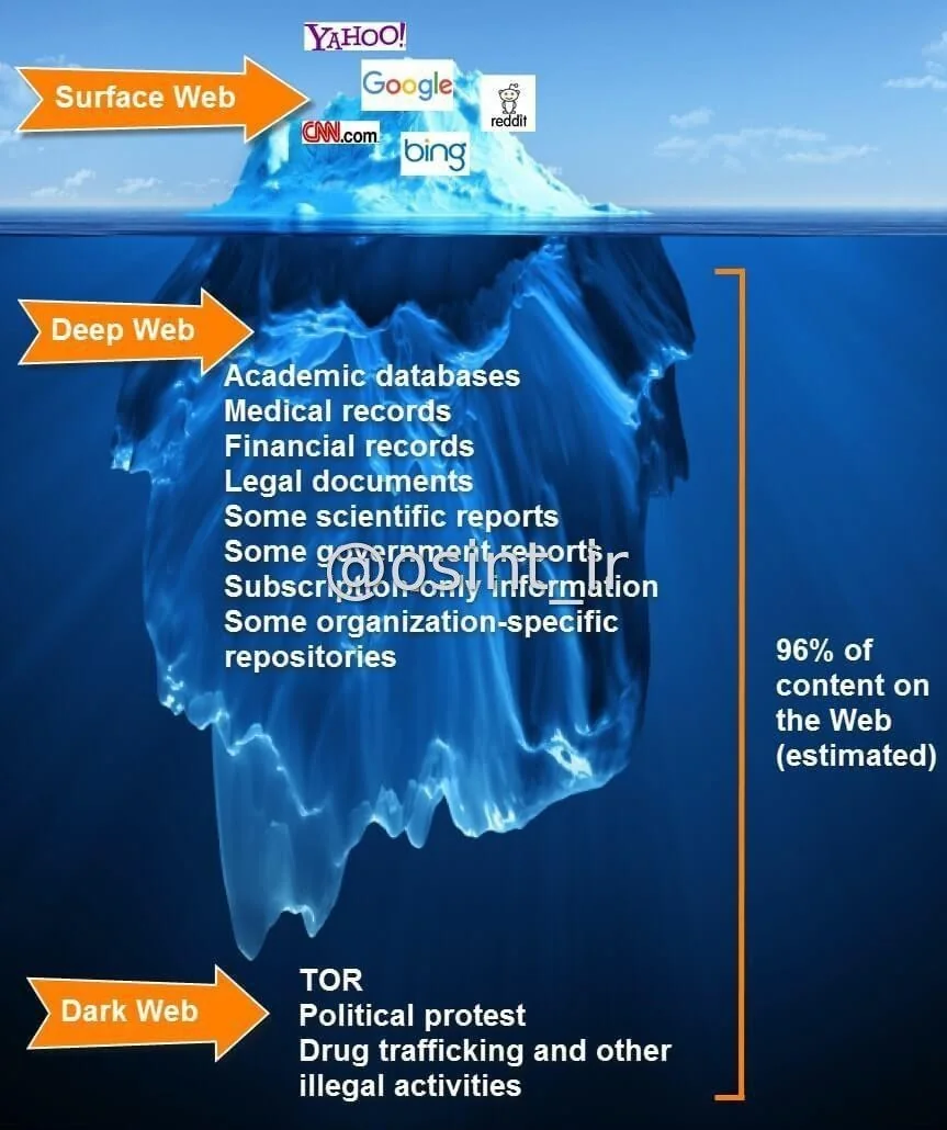 تعجب کردید! بله تنها 5 درصد و به آن اینترنت سطحی یا Surface web میگویند؛ 95 درصد باقیمانده یعنی وب عمیق (Deep web) و وب تاریک (Dark web) نام دارد. (تسنیم)