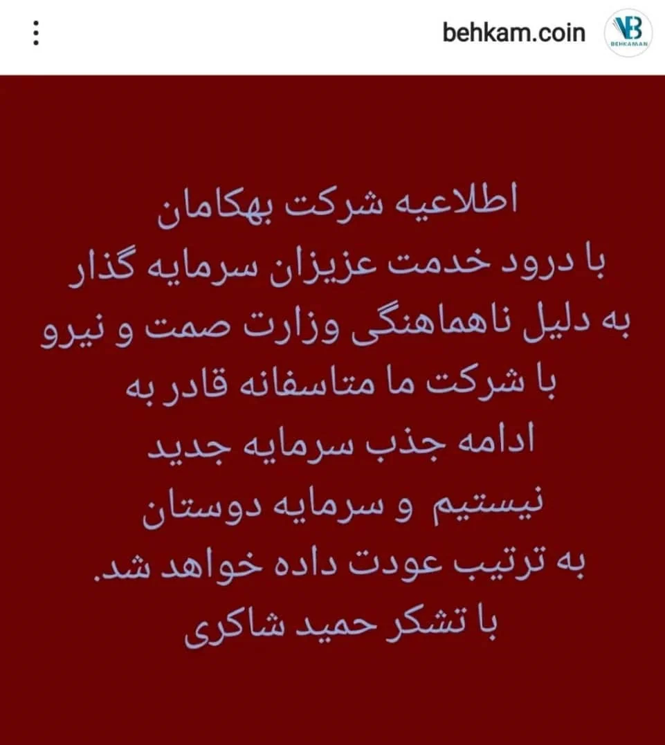 در انتهای گزارش مذکور نیز مطرح شد که صفحه اینستاگرام این شرکت در ۲۱ دی سال اخیر طی پیامی از طرف مدیرعامل خود اعلام کرد، به دلیل ناهماهنگی وزارت‌خانه‌های صمت و نیرو قادر به ادامه فعالیت نبوده و سرمایه‌های مردم برگردانده‌ خواهد شد، که همچنان این پیام وجود دارد.