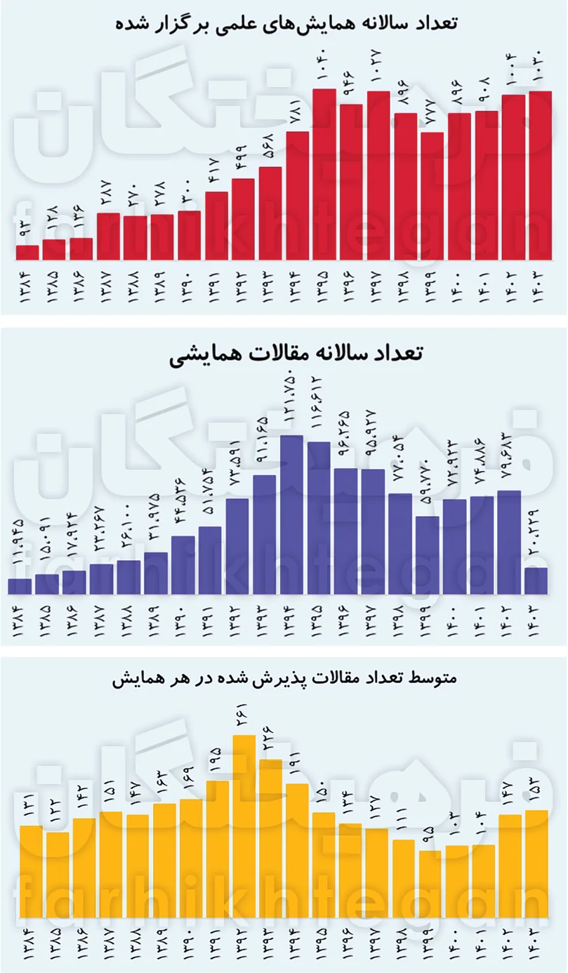 اما با وجود نوسانات، درنهایت ایران شاهد رشد ۶۹.۵ درصدی در تولید مقالات همایشی از سال ۱۳۸۴ تا ۱۴۰۳ بوده است. دادههای آماری نشان میدهد تعداد کنفرانسهای علمی در کشور از ۹۳ مورد در سال ۱۳۸۴ به ۱۰۳۰ کنفرانس در سال ۱۴۰۳ رسید که رشدی بیش از هزار درصدی را تجربه کرده است.