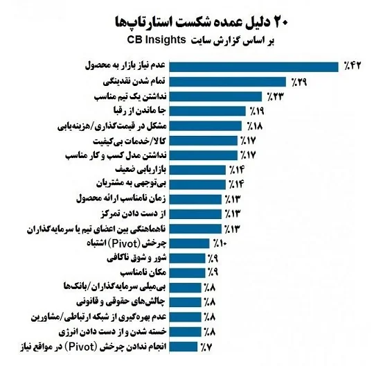 از سوی دیگر به شکل کلی 20 دلیل عمده شکست استارتآپها و کسبوکارهای نوپا در دنیا را میتوان در تصویر ملاحظه کرد.