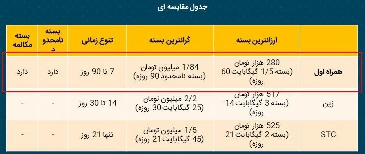 در مورد گرانترین بسته همراه اول در مقایسه با این دو اپراتور نیز تفاوت قیمت، بستهها و مدت استفاده از آنها نیز به همین روال است که در جدول مقایسهای آمده است.