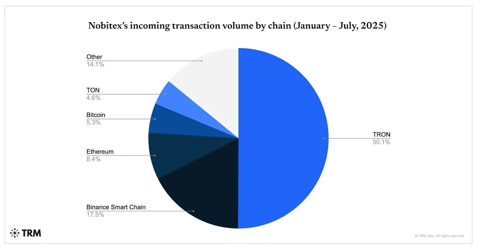 نوبیتکس همچنان مهمترین صرافی ایران از نظر سیستماتیک است و بیش از 87 درصد از کل حجم تراکنشهای مرتبط با ایران در سال ۲۰۲۵ را مدیریت میکند. تقریباً دوسوم این فعالیت، از طریق شبکهTRON و عمدتاً درTRC-20 USDT در جریان است که اهمیت پلتفرم و ریسکهای سیستماتیک مرتبط با آن را نشان میدهد.