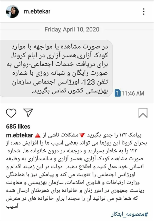 البته شاید معصومه ابتکار انتساب این صفحه به خودش را تکذیب کند و مدعی شود اساسا هیچ دخالتی در ارسال این پیامک نداشته است. برای این منظور به سراغ سایت سازمان بهزیستی رفتیم. همانجایی که معصومه محمدی سرپرست بهزیستی استان چهارمحال و بختیاری صراحتا اذعان می‌کند که «با هماهنگی وزارت ارتباطات و فناوری اطلاعات، سازمان بهزیستی و معاونت ریاست جمهوری در امور زنان و خانواده وزارت بهداشت پیامکی برای خانواده ها ارسال کرد و از آنها خواست در صورت مشاهده کودک آزاری، همسر آزاری و سالمندآزاری به وظیفه انسانی خود عمل کنید و اطلاع دهید.»