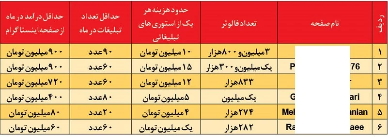 شاید باورتان نشود ولی برخی از کودکان در اینستاگرام با وجود داشتن کمتر از یک میلیون دنبال کننده، ماهانه بیش از یک میلیارد تومان درآمد دارند. جدا از آن چه درباره درآمد روزانه سه تا پنج میلیونی این کودکان نوشتیم، آن ها از صفحات اینستاگرامی شان هم کسب درآمد دارند که بسته به تعداد فالوئرشان متغیر است. برای نمونه، تعدادی از این کودکان را که درآمدهایی از 80 تا 900 میلیون تومان دارند برای تان در جدول زیر نوشته ایم.در ضمن در کنار رشد صفحات این کودکان پدر و مادر ها هم صفحاتی را برای خودشان راه اندازی و در آن به طور مجزا کسب درآمد می کنند. به طور مثال حداقل تعرفه تبلیغ در صفحه مادر آیروس 9 میلیون تومان است و صفحه پدر پژمان هم برای هر تبلیغ 7 میلیون تومان دریافت می کند. (منبع:خراسان)