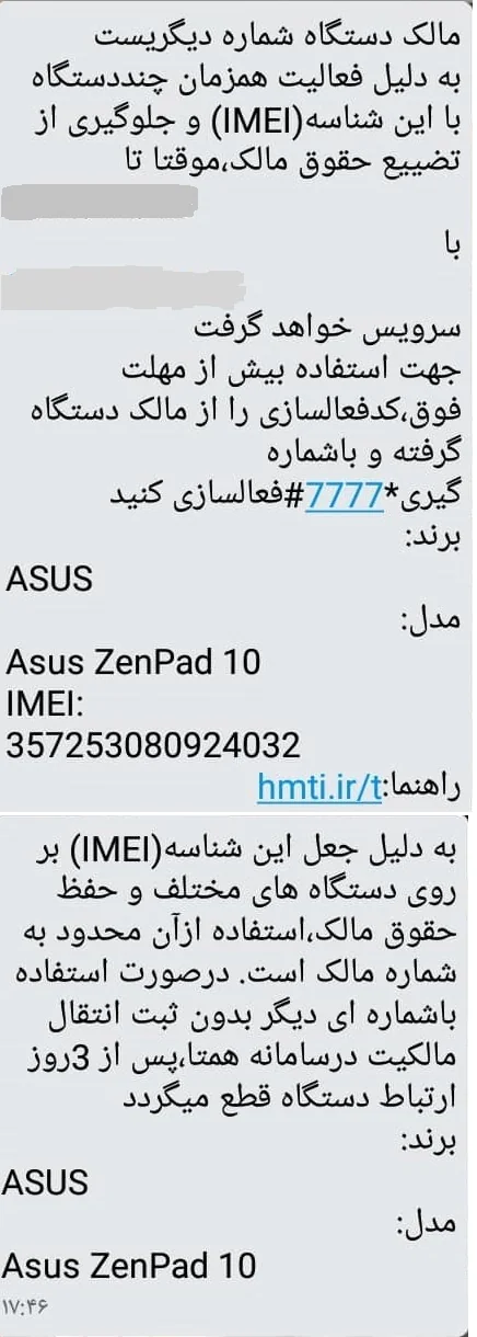 چند ماهی است به علت اینکه گوشی همراهم سوخت و به علت نداشتن هزینه خرید بخاطر گرانی تلفنهای همراه گوشی دست دوم پسرم را به امانت گرفتم بعد از چند روز پیامکی از همتا برایم آمد که این گوشی مالکش شخص دیگریست و باید کدی را از ایشان بگیرم و ارسال کنم تا خط من قطع نشود به همین دلیل از پسرم سوال کردم ایشان گفت من این گوشی را یکسال پیش از پاساژ علاالدین بصورت دست دوم خریداری کردم و در این مدت هم هیچ پیامی نیامده است به همین دلیل من سیم کارت دیگری روی گوشی گذاشتم و با اون خطم شروع بکار کردم پیامکی آمد اما دو سه ماهی خبری از قطع خط من نبود تا اینکه امروز پیامکی آمد که از این تاریخ خط شما قطع می شود بخاطر اینکه من هیچگونه دسترسی به صاحب اولیه گوشی ندارم کد استعلام اصالت گوشی را انجام دادم که اعلام کرد از (IMEI) در چند گوشی استفاده می شود به همین دلیل گوشی شما غیر فعال می شود . و برای بنده این سوالاتی مطرح است
