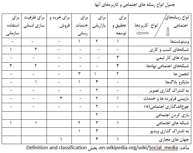 علاوه بر همۀ ایرادات مذکور، ایراد اصلی این است که عموم کاربران رسانه های اجتماعی، و در رأس همۀ آنها نمایندگان شان، احتمالاً شناخت کافی از انواع رسانه های اجتماعی و کاربردهای آنها ندارند. نگاه کنید به جدول زیر که به انواع رسانه های اجتماعی، کاربردهای آنها و به روابط متقابل میان آنها میپردازد.
