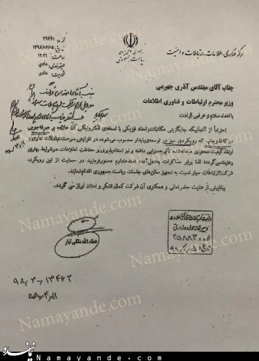 همانطور که در تصویر شمارۀ یک قابل مشاهده است، وزیر ارتباطات بالای درخواست ۲۰۰ دستگاه لپ تاپ از جانب مسئول مرکز فناوری اطلاعات، ارتباطات و امنیت نهاد ریاست جمهوری، خطاب به مدیرعامل شرکت ارتباطات سیار دستور اقدام در راستای انجام این کار را داده است.