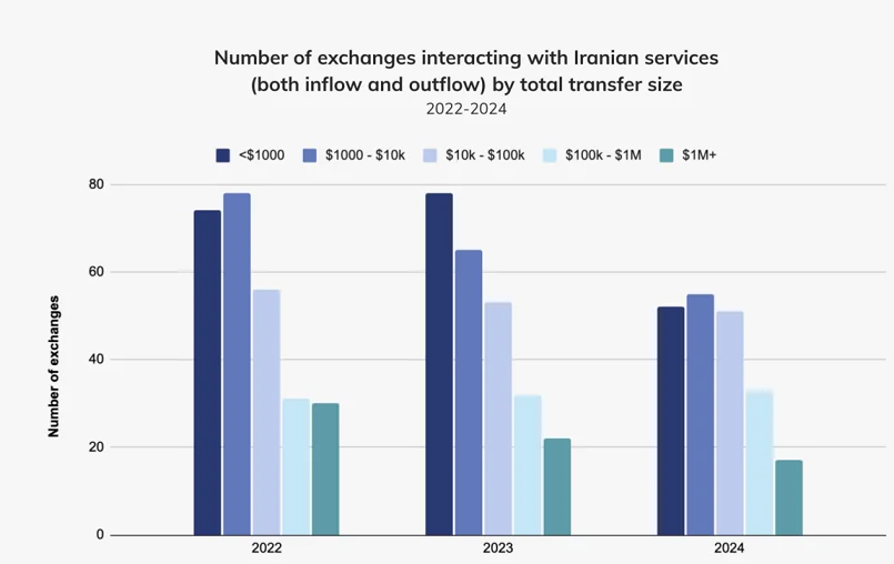 اگرچه بسیاری از ایرانیان برای خروج سرمایه به رمزارزها متکی بودهاند اما برنامههای نظارتی در اکوسیستم جهانی رمزارزها در حال بستن این مسیرها هستند. با تمرکز فزاینده بر رعایت مقررات، میزان تعامل صرافیهای جهانی با سرویسهای ایرانی در هر سال کاهش مییابد و بین سالهای ۲۰۲۲ تا ۲۰۲۴، حدود 23 درصد، افت داشته است.