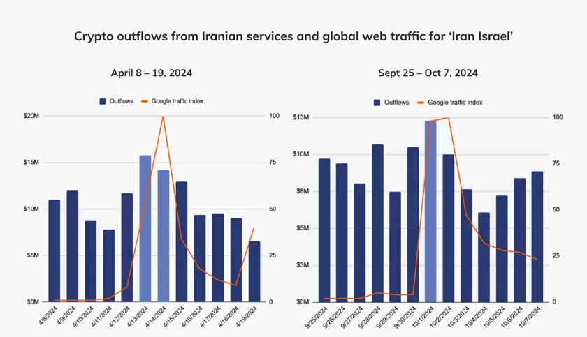 افزایش خروجیهای بیتکوین در زمانهایی رخ داد که احتمال حمله موشکی ایران و همچنین چند روز پس از این رویدادها آشکار شد؛ همانطور که در ۹ و ۱۴ آوریل ۲۰۲۴ و به طور مشابه، در اواخر سپتامبر و اوایل اکتبر ۲۰۲۴ مشاهده شد.