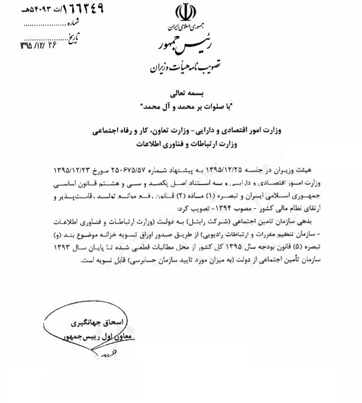 بر اساس مصوبه هیئت دولت و به پیشنهاد وزارت اقتصاد، بر مبنای قانون رفع موانع تولید رقابت پذیر، بدهی سازمان تامین اجتماعی به وزارت ارتباطات و فناوری اطلاعات از طریق صدور اوراق خزانه، تسویه خواهد شد.