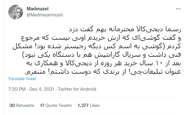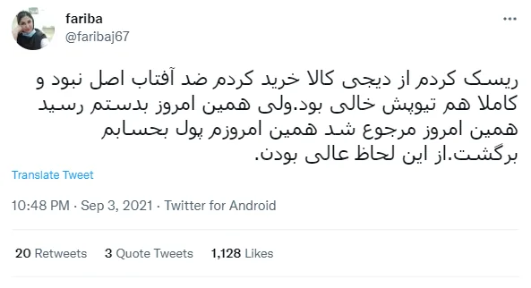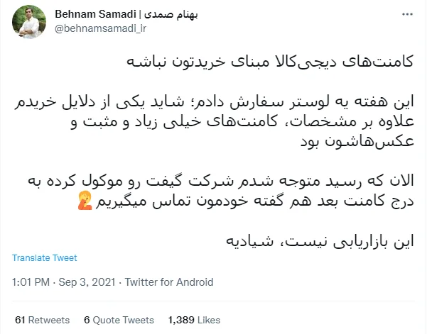 افزایش قیمت برخی کالاها نسبت به بازار، بالابردن کف حداقلی ارسال رایگان و همچنین تاخیر و ناهماهنگی در ارسال سفارش‌ها، از اصلی‌ترین دلایل نارضایتی‌ها در فضای توئیتر فارسی بوده است. به نظر می‌رسد با توجه به پتانسیل‌های بالای خرید آنلاین در ایران و جهان و همچنین مشکلات مختلف در زمینه اشتغال و بیکاری، حمایت از دیگر برندهای خریدآنلاین علاوه بر رقابتی‌کردن بازار و افزایش کیفیت خدمات، مشکلات کارآفرینی و بیکاری را تاحد زیادی کاهش خواهد داد.