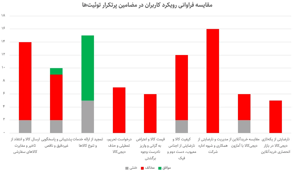برخی مضامین همچون «ارسال کالا، پشتیبانی، کیفیت کالا و مقایسه خرید آنلاین» از محتواهایی بودند که به جز درصد بالای نارضایتی، بخشی از نظرهای خنثی را نیز شامل شدند. در سوی مقابل نیز، درصد همراهی و رضایت کاربران از این برند در مضمون تمجید از ارائه خدمات به خوبی نمایان شده است. این مضمون به همراه مضمون پشتیبانی، تنها مضامینی بودند که تا حدی موافقت و همراهی کاربران توئیتر را نسبت به برند دیجی‌کالا به همراه داشته‌اند.