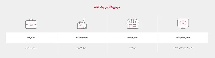 بنا بر آمار منتشر شده تا اوایل سال ۱۴۰۰، در این بستر بیش از ۴ میلیون کالای مختلف توسط ۱۶۰ هزار فروشنده برای فروش عرضه شده‌ و ظرفیت پردازش ۶۰۰ هزار کالا در روز را دارد. مدل کسب‌وکار دیجی‌کالا یک آمیختگی از بازارگاه مجازی و خرده‌فروشی است.