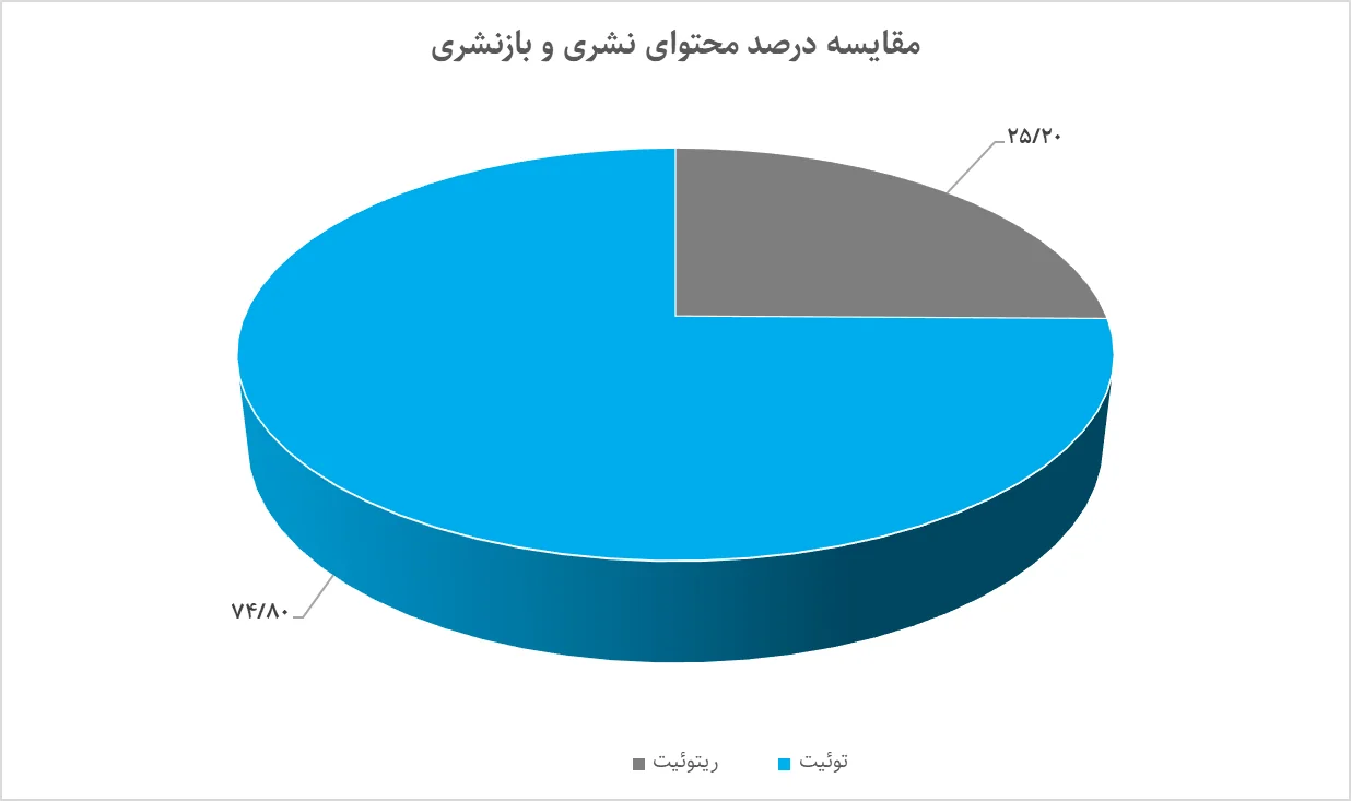 مقایسه محتوای نشری یا توئیت و محتوای بازنشری یا ریتوئیت، شاخص دیگری برای بررسی مشارکت کاربران در موضوع‌های ترند شده در توئیترفارسی است. به‌گونه‌ای که در این گزارش شاهد حجم بالای توئیت‌ها (۷۴.۸۰) نسبت به میزان ریتوئیت‌ها(۲۵.۲۰) بودیم.