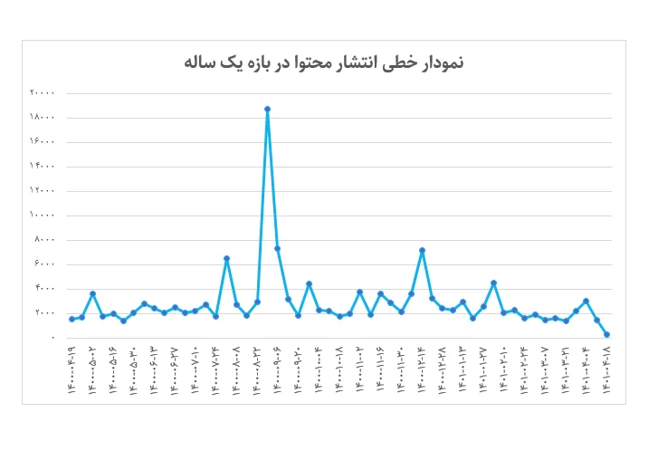 تحلیل خط سیر انتشار مطالب در بازه زمانی یک ساله این گزارش به خوبی روند صعودی و نزولی و فراز و نشیب‌های تولیدمحتوا در این موضوع را نشان می‌دهد. قله اصلی این نمودار در اواخر آبان ماه(۲۹ آبان) و مربوط به زمانی است که تخفیف‌های مربوط به بلک فرایدی(جمعه سیاه) در سایت دیجی‌کالا اعمال و حجم زیادی از کاربران در این مدت درباره معایت و مزایای این کالاها و خدمات ابراز نظر کردند. داده‌های آماری بیانگر آن است که فقط در روز ۲۹ آبان، ۱۸ هزار ۶۶۲ توئیت منتشر شده است.