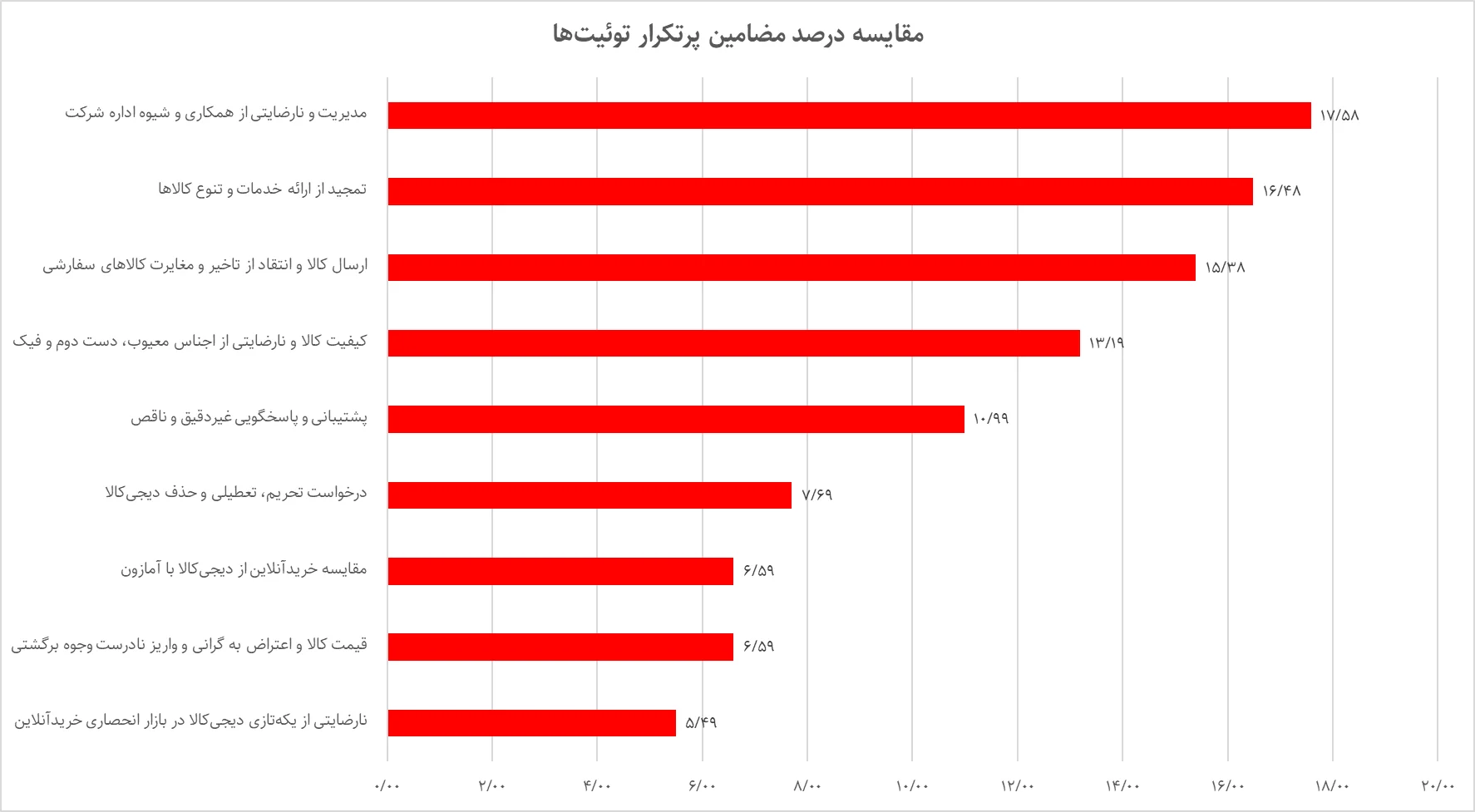 از میان تم‌های انتقادی، کاربران درباره «کیفیت کالا، ارسال، پشتیبانی، مدیریت، قیمت و بازار انحصاری این برند» ابراز نارضایتی و انتقاد کردند. در مقابل، مضمون تمجید از ارائه خدمات و تنوع کالاها با ۱۶.۴۸ درصد مثبت‌ترین مضمونی بود که توئیتری‌ها میزان رضایت و همراهی خود را با برند دیجی‌کالا ابراز کردند.