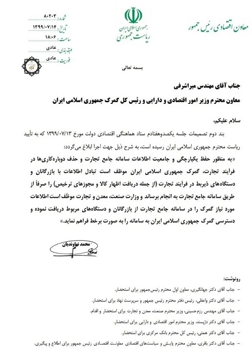 به گزارش تسنیم،‌ مهر ماه امسال نهاوندیان معاون اقتصادی رئیس جمهور در مکاتبه‌ای با میر اشرفی رئیس کل گمرک ایران، اعلام کرد، بر اساس مصوبه ستاد اقتصادی دولت که به تایید رئیس جمهوری رسیده، به منظور حفظ یکپارچگی و جامعیت اطلاعات سامانه جامع تجارت و حذف دوباره‌کاریها در فرآیند تجارت، گمرک جمهوری اسلامی ایران موظف است تبادل اطلاعات با بازرگانان و دستگاههای ذیربط در فرآیند تجارت (از جمله دریافت اظهار کالا و مجوزهای ترخیص) را صرفاً از طریق سامانه جامع تجارت به انجام برساند.