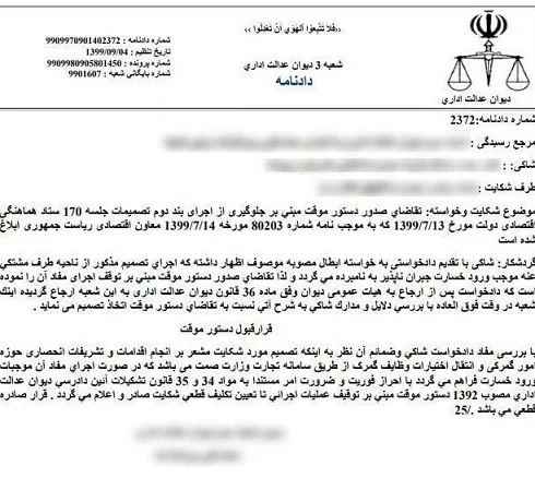 در قرار قبول دستور موقت آمده است، با بررسی مفاد دادخواست شاکی و با توجه به تشریفات انحصاری  حوزه امور گمرکی، در صورت اجرای مفاد ابلاغیه جلسه 170 ستاد  اقتصادی دولت،  موجبات ورود خسارت فراهم می‌شود، دستور موقت مبنی بر توقیف عملیات اجرایی تا تعیین تکلیف قطعی شکایت صادر و اعلام میگردد.
