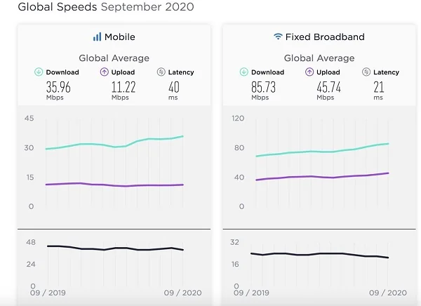 به گزارش خبرگزاری مهر به نقل از اسپید تست، گزارش متوسط سرعت اینترنت جهانی منتشرشده است. طبق این گزارش متوسط سرعت جهانی اینترنت موبایل در سپتامبر ۲۰۲۰ میلادی ۳۵.۹۶ مگابیت برثانیه و متوسط سرعت جهانی اینترنت ثابت ۸۵.۷۳ مگابیت برثانیه بوده است.
