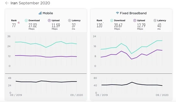 در رده بندی متوسط سرعت اینترنت موبایل ایران در رتبه ۷۷ قرار دارد که نسبت به ماه گذشته ۵ پله سقوط کرده است. همچنین در رده بندی متوسط سرعت اینترنت ثابت، ایران بدون هیچ تغییری نسبت به ماه قبل در رتبه ۱۲۰ قرار دارد.