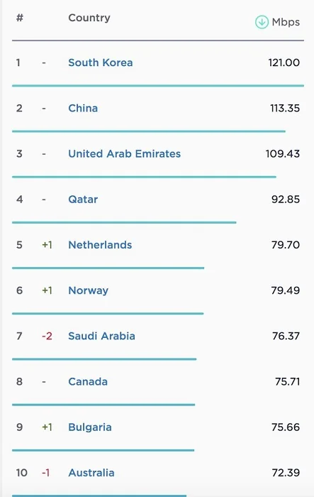 در رده‌های سوم، چهارم، پنجم و ششم به ترتیب امارات متحده عربی (با سرعت ۱۰۹ مگابیت برثانیه)، قطر (با سرعت ۹۲.۸۵ مگابیت برثانیه)، هلند (با سرعت ۷۹.۷۰ مگابیت برثانیه) و نروژ (با سرعت ۷۹.۴۹ مگابیت برثانیه) قرار دارند.