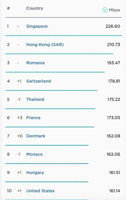 سوئیس با سرعت ۱۷۸.۸۱ مگابیت برثانیه در رده چهارم این فهرست قرار دارد. تایلند (با سرعت ۱۷۵.۲۲ مگابیت برثانیه) و فرانسه (با سرعت ۱۷۳.۰۵ مگابیت برثانیه) در رتبه‌های پنجم و ششم هستند.