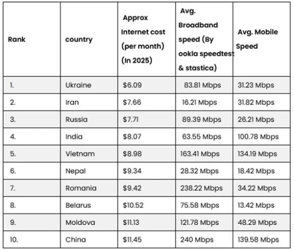 - اوکراین: اوکراین در سال ۲۰۲۵، ارزانترین اینترنت همراه در جهان را ارائه میدهد؛ با سرعت متوسط ۸۳.۸۱ مگابیت بر ثانیه برای اینترنت ثابت و ۳۱.۲۳ مگابیت بر ثانیه برای اینترنت همراه،. این کشور در کنار سرعت مناسب، هزینه پایینی دارد. علت اصلی این امر، رقابت شدید بین شرکتهای مخابراتی داخلی و هزینههای زیرساختی مقرونبهصرفه است.