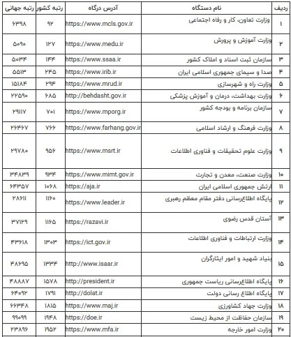 سازمان فناوری اطلاعات جدول رده بندی سایتهای دولتی را طبق ابزار رتبه بندی الکسا منتشر کرد.