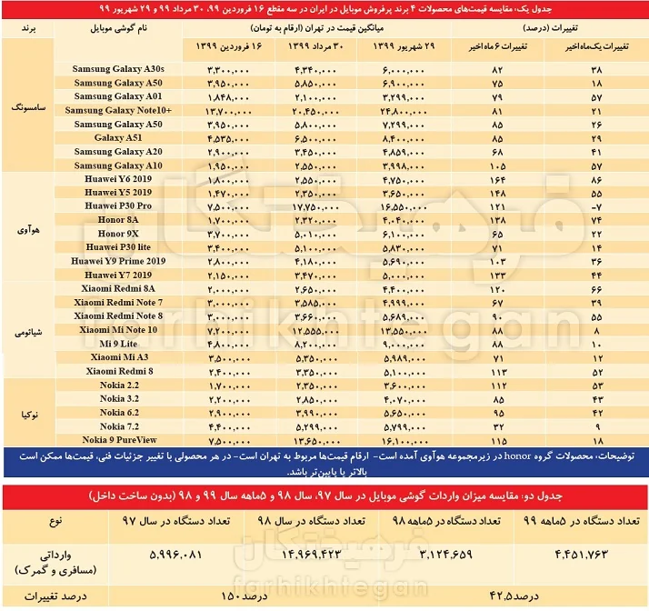 برای مثال قیمت گوشی پایینرده Huawei Y6 2019 در 6ماهه 164 درصد و در یکماه اخیر نیز 86 درصد رشد داشته است، گوشی پایین رده Huawei Y5 2019 نیز طی 6 ماه 148 درصد و در یکماه اخیر نیز 55 درصد رشد داشته است. در دیگر محصولات این برند نیز همین موضوع مصداق داشته و قیمت گوشیهای پایینرده که پیشتر اغلب خانوارها برای اتصال به شبکه شاد متقاضی آن بودند، حالا به طرز چشمگیری افزایش یافته و از حدود 1.5 تا 1.8 میلیون تومان به حدود 4 تا 4.7 میلیون تومان نیز رسیده است.