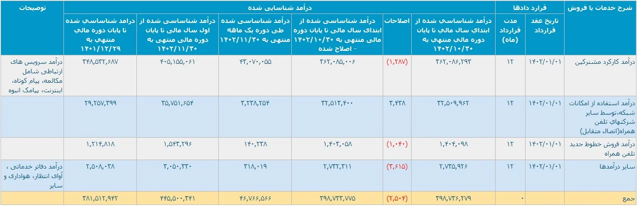 این شرکت بورسی در عملکرد 11 ماهه بالغ بر 44.5 هزار میلیارد تومان درآمد شناسایی کرد و نسبت به مدت مشابه سال قبل با رشد 33 درصدی روبرو شد. بیشترین درآمد کسب شده طی این دوره از کارکرد مشترکین و به میزان 40.5 هزار میلیارد تومان بود که معادل 91 درصد درآمدها از این محل کسب شده است.