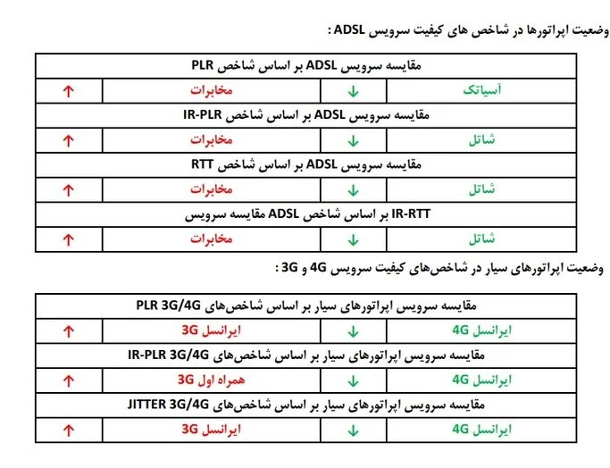 در تمامی شاخصهای مورد نظر در این گزارش ۴G ایرانسل سبز و ۳G ایرانسل و ۳G همراه اول قرمز بوده است.
