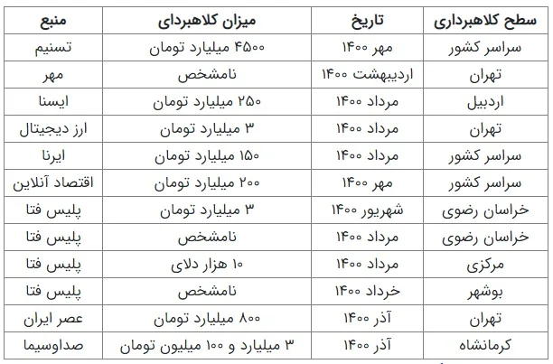 با نگاهی گذرا به اخباری که در سال جاری از سوی پلیس فتا در رسانهها منعکس شده درمییابیم که از ابتدای سال بیش از ۵۰ هزار میلیارد ریال از دارایی مردم توسط کلاهبرداران حوزه رمزارز به سرقت رفته است. در جدول زیر کلیات این کلاهبرداریها ذکر شده است.