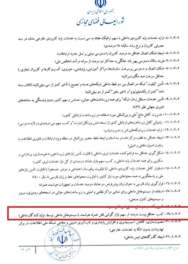 بعد از حدود ۵ سال از ابلاغیه مهم شورای عالی فضای مجازی، هدف گذاری طرح کلان و معماری شبکه ملی اطلاعات برای سال ۱۴۰۴ درخصوص تولید داخل تلفن همراه محقق نشده است.