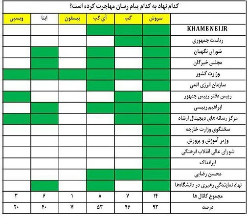 بررسی کانال های 15 فرد، نهاد و دستگاه دولتی و عمومی کشور که نشانی جدید کانال شان را در پیام رسان های داخلی اعلام کرده اند، نشان می دهد که جز محمود واعظی رییس دفتر رییس جمهور، همگی در پیام رسان سروش کانال باز کرده اند. به این ترتیب می توان سروش را محبوب ترین پیام رسان نهادهای حکومتی و دولتی دانست.
