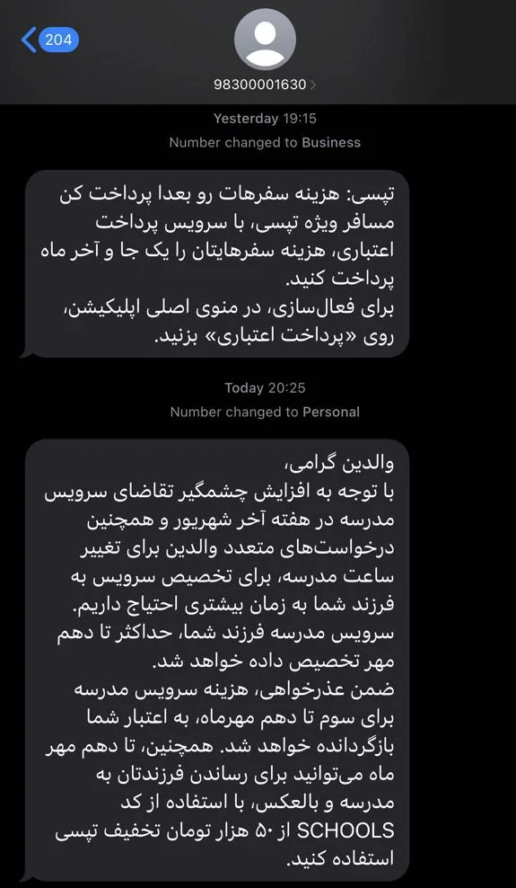 ضمن عذرخواهی، هزینه سرویس مدرسه برای سوم تا دهم مهرماه، به اعتبار شما بازگردانده خواهد شد. همچنین، تا دهم مهر ماه میتوانید برای رساندن فرزندتان به مدرسه و بالعکس، با استفاده از کد SCHOOLS از ۵۰ هزار تومان تخفیف تپسی استفاده کنید.»