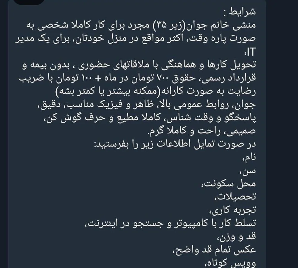 اگر برای یافتن شغل سری به آگهیهای فضای مجازی یا برنامههای تبلیغاتی زده باشید، قطعاً با آگهیهای جذب منشی یا دستیار مواجه خواهید شد. آگهیهایی که از در آنها مهارت شغلی و تخصص نیرو برای کارفرما اهمیتی ندارد و تنها معیار شغلی لازم برای استخدام، ظاهر آراسته زنان و پذیرفتن خواستههای خارج از حیطه کاری کارفرما است.