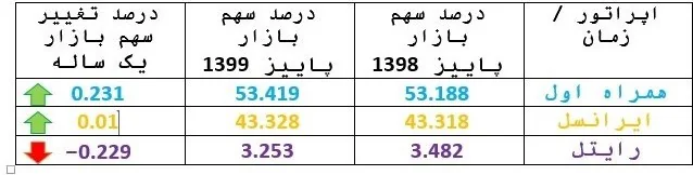 در نگاه اول به آمار پاییز 1399 و مقایسه آن با پاییز 1398، متوجه تغییر میزان «سهم بازار» اپراتورهای تلفن همراه از سال گذشته تاکنون به شرح جدول زیر میشویم: