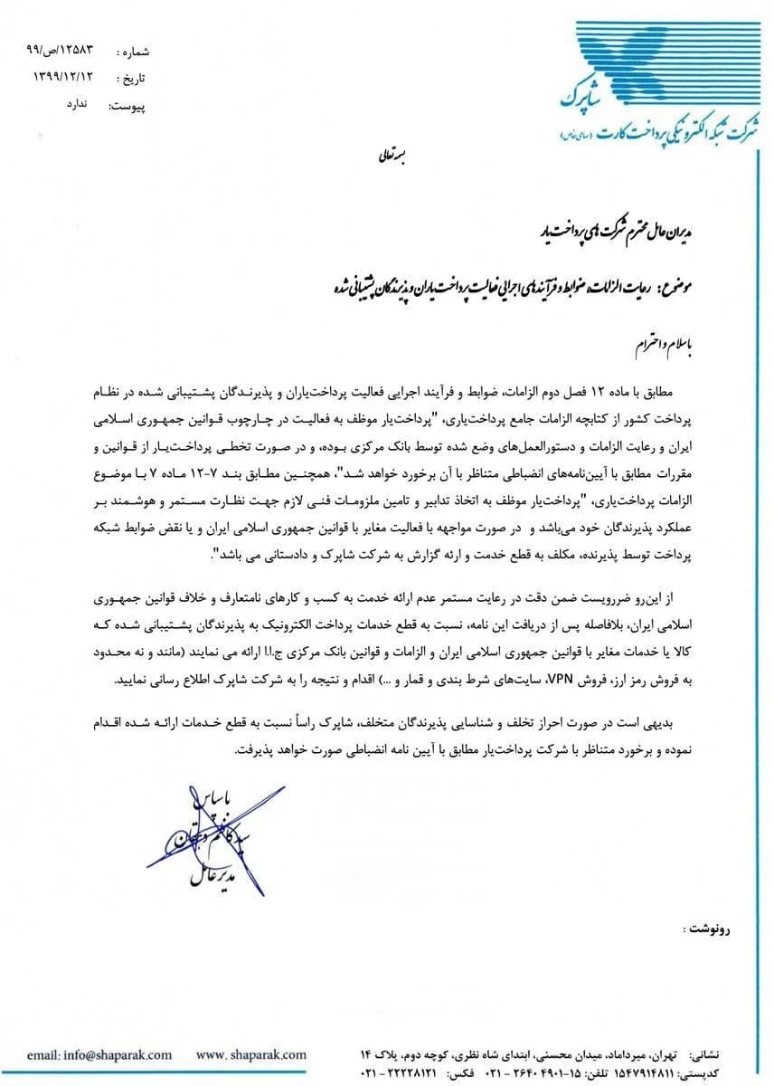 پس از طرح این موضوعات، شرکت شاپرک در نامهای به پرداخت یاران و پذیرندگان پشتیبانی شده در نظام پرداخت کشور اعلام کرد که ضروری است ضمن دقت در رعایت مستمر عدم ارائه خدمت به کسبوکارهای نامتعارف و خلاف قوانین جمهوری اسلامی ایران، بلافاصله پس از دریافت این نامه نسبت به قطع خدمات پرداخت الکترونیک به پذیرندگان پشتیبانی شده که کالا یا خدمات مغایر با قوانین جمهوری اسلامی ایران و الزامات بانک مرکزی ارائه میکنند (مانند و نه محدود به فروش رمز ارز، فروش VPN، سایتهای شرط بندی و قمار و…) اقدام و نتیجه را به شرکت شاپرک اطلاع رسانی کنند.